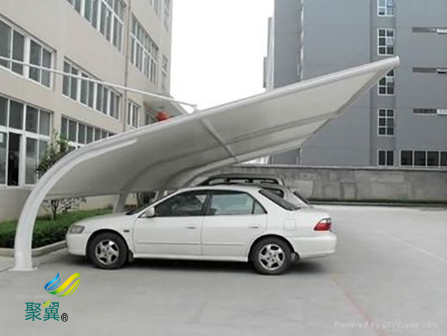膜結構車棚膜資料的光折射率是超越70%的陽光,膜結構車棚棚內柔和散光,膜結構車棚給人舒服、夢幻般的感受。