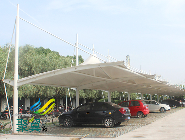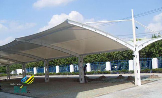 利用邊鎖的拉力及膜結構車棚膜材的形狀構成造型,盡可能的減少結構體型對膜結構車棚膜材的視覺影響,膜材經常采用彩色膜,以體現膜結構車棚千變萬化的浪漫情懷! 膜結構車棚的輕巧,別致的造型建造各種半封閉,全封閉的空間,使其形成全天候的建筑空間,膜結構車棚提供防風雨,防日曬等人工環境,并有較好的廣告標識效果,因此是步行街改造和新建的選擇。