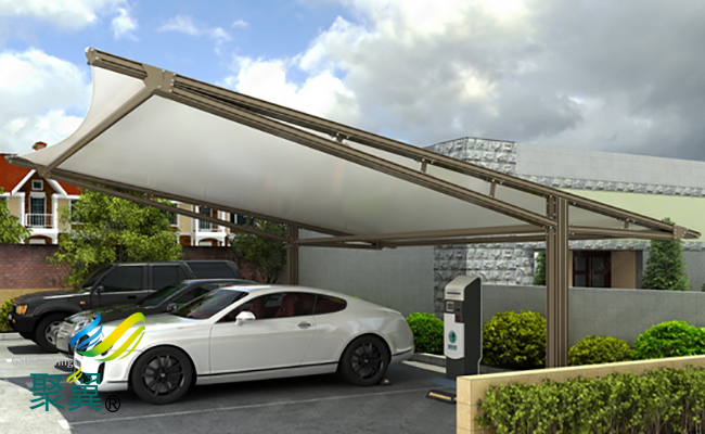 膜結構車棚是一種新型的大跨度空間結構,越來越受到用戶的喜愛和使用,膜結構車棚是由具有優良性能的織物(膜材)通過支撐構件(如剛性梁、柱、柔性索),而膜結構車棚膜材料是大跨度空間結構最重要的組成部分,被稱為“第五代建材”。