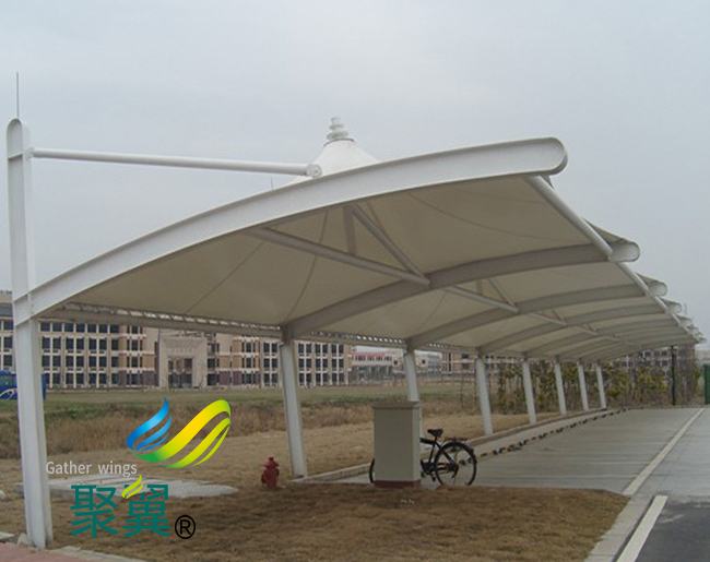 膜結構車棚所用膜材料由基布和涂層兩部分組成。膜結構車棚具有強度低、彈性大、易老化、徐變大、自潔性差,但價格便宜,容易加工制作,色彩豐富,抗折疊性能好等等特點。