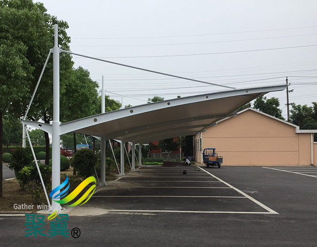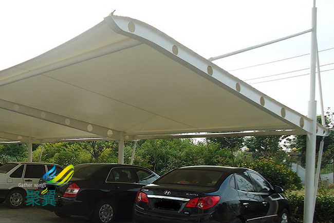 膜結構車棚材料上,通過支撐和張拉索就能構成,所以膜結構車棚可以通過自身柔美的曲線和周圍的藝術景觀結合起來,給人以美的享受。