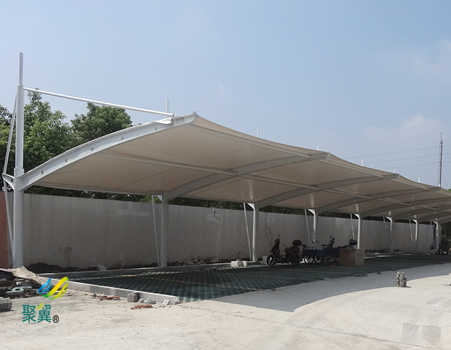 膜結構車棚,自重輕,具有良好的受力特點——成為大跨度空間結構的主要形式之一。 膜結構車棚的規劃和建設成為現代城市規劃的重要組成部分,在以后的建設里會變得越來越重要。 膜結構車棚輕巧、別致的造型在停車場及候車廳的建設中擔當了重要角色,除了滿足防風雨、防日曬等基本功能外,并有較好的標識招攬效果,展現了人們個性化的一面。