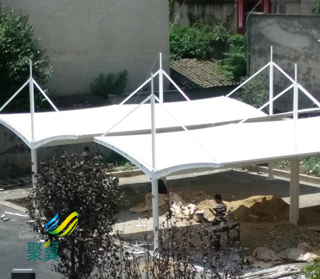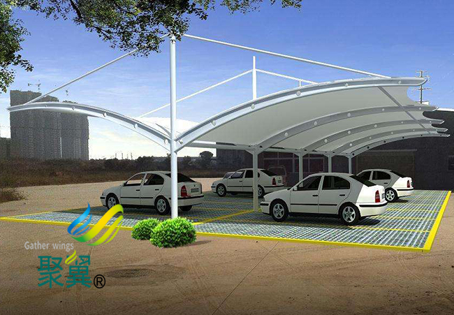 膜結構車棚的主要特點, 透光性半透明是膜結構顯著的特征,與其它材料相比,無論是在美觀上或是在操作上,都有顯著的優越性;膜結構車棚散射光線,消除眩光,能將光線廣泛地漫射到其內部空間。