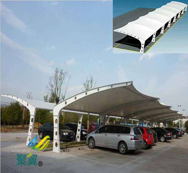 膜結(jié)構(gòu)車棚具有良好的環(huán)保性、透光性、自清潔性,膜材表面采用PVDF(聚偏二氟乙烯)涂層、或二氧化鈦涂層,具有較好的隔熱效果,對(duì)太陽(yáng)熱能可反射掉70%,膜結(jié)構(gòu)車棚膜材本身吸收了17%,傳熱13%,而透光率卻在20%以上,經(jīng)過10年的太陽(yáng)光直接照射,膜結(jié)構(gòu)車棚輝度仍能保留70%。