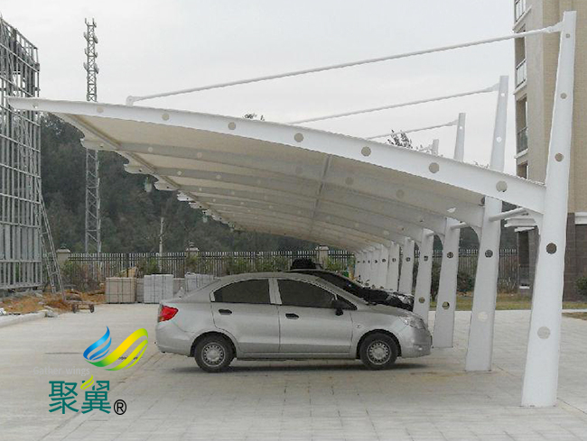 膜結構車棚工程能提供豐富多彩的用途,并與園林景觀溶為一體,創造出讓人們盡情享受的快樂空間,充分展示了結構構件清晰受力的藝術之美,景觀膜結構車棚用來做公園小品建筑,為這景觀環境裝飾更添藝術色彩。帶給人們不同的環境轉換感,新鮮感。膜結構車棚巧妙的融合周圍的環境,給人們一種典雅、浪漫溫馨之感。另外由于膜結構車棚膜材料本身特有的顯色性,在夜間彩燈的映射下能形成絢麗繽紛的景觀。