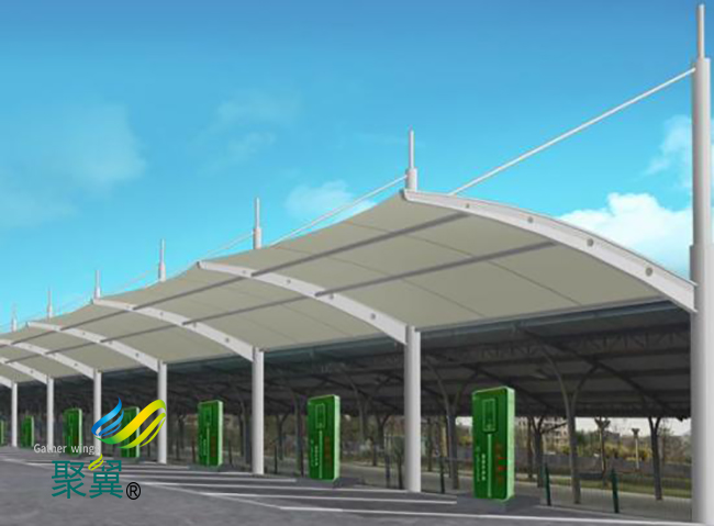 膜結(jié)構(gòu)車棚即為織物結(jié)構(gòu),是近幾十年來(lái)發(fā)展起來(lái)的一種新型大跨度空間結(jié)構(gòu)形式,最早的膜結(jié)構(gòu)車棚出行可追溯到帳篷結(jié)構(gòu)。