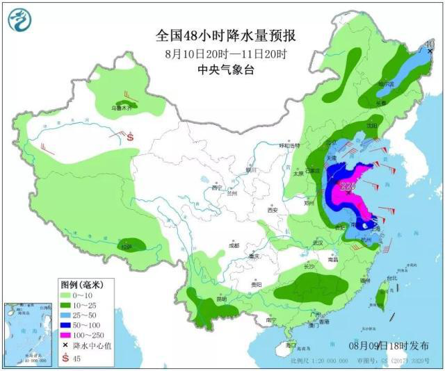 中央氣象臺預計,10日,浙江、江蘇、上海、安徽、山東普遍會出現大到暴雨,其中,山東中部、安徽東南部、江蘇北部和南部、上海、浙江北部等地部分地區有大暴雨,浙江北部局地特大暴雨。 浙江北部、上海、江蘇、山東南部等地的部分地區有6—8級風。
