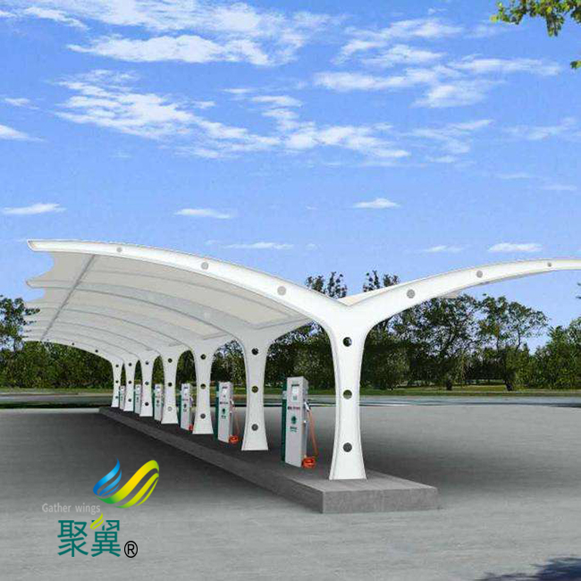 膜結構車棚建筑設計師提供了更大的想象和創造空間。具有良好的環保性、透光性、自清潔性,膜結構車棚膜材表面采用PVDF(聚偏二氟乙烯)涂層、或二氧化鈦涂層,膜結構車棚具有較好的隔熱效果,對太陽熱能可反射掉70%,膜結構車棚膜材本身吸收了17%,傳熱13%,而膜結構車棚透光率卻在20%以上,經過10年的太陽光直接照射,膜結構車棚輝度仍能保留70%。