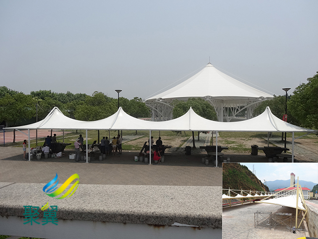 膜結構車棚造型獨特、輕巧、極富時代氣息,用來制作街頭的小品也十分合適 ,像是步行街的雕塑、街頭綠化的涼亭,或是廣場、公園的入口等等,膜結構車棚充滿個性的造型**標志性。另外膜結構車棚易于拆裝、移動,施工便捷,在臨時性建筑的塑造上**方便。