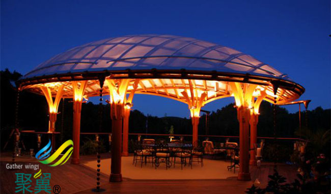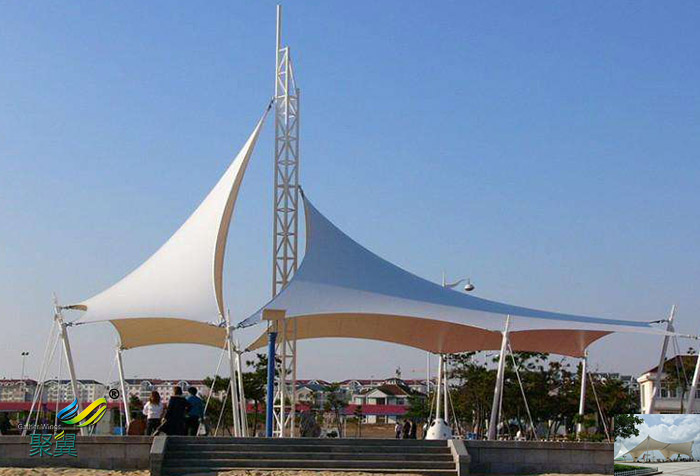 張拉膜景觀棚,指的是具有景觀效果的張拉膜遮陽棚。一般應(yīng)用于旅游景點較多,也包括園林、小區(qū)、娛樂場所等地的膜結(jié)構(gòu)遮陽設(shè)施,主要起到裝飾、遮陽、擋雨等作用。張拉膜景觀棚中所有加工和制作均在工廠內(nèi)完成,可減少現(xiàn)場施工時間,避免出現(xiàn)施工交叉,相對傳統(tǒng)建筑工程工期較短。膜材料具有極高的非粘著性,在我們?nèi)粘J褂貌徽村仌r就可以體會到這一特性。膜材料的表面不僅不易附著臟物及灰塵,而且其表面的灰塵會被雨水自然地沖洗干凈,所以常年使用仍然保持外觀的潔凈及室內(nèi)的美觀。