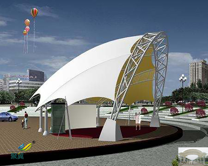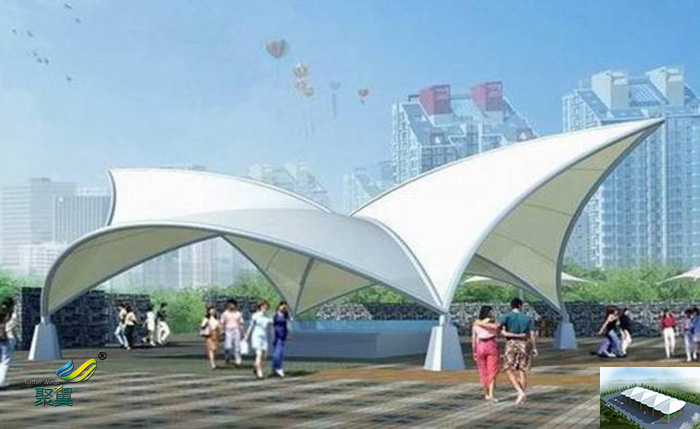 2.張拉膜傘景觀棚經濟性:由于膜材具有一定的透光率,白天可減少照明強度和時間,能很好地節約能源。同時夜間彩燈透射形成的絢爛景觀也能達到很好的廣告宣傳效益。膜建筑屋面重量僅為常規鋼屋面的1/30,這就降低了墻體和基礎的造價。同時膜建筑奇特的造型和夜景效果有明顯的“建筑可識性”和商業效應,其價格效益比更高。
