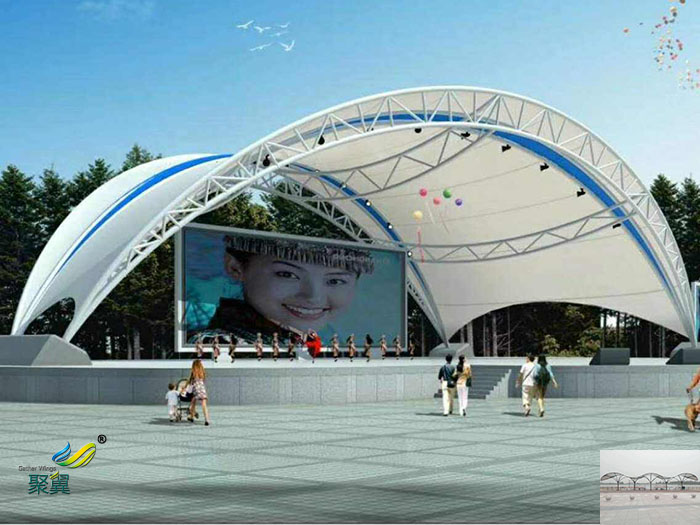 1、舞臺張拉膜結構的共同曲面外形使其具有激烈的雕塑感,膜面經過張力到達自平衡。