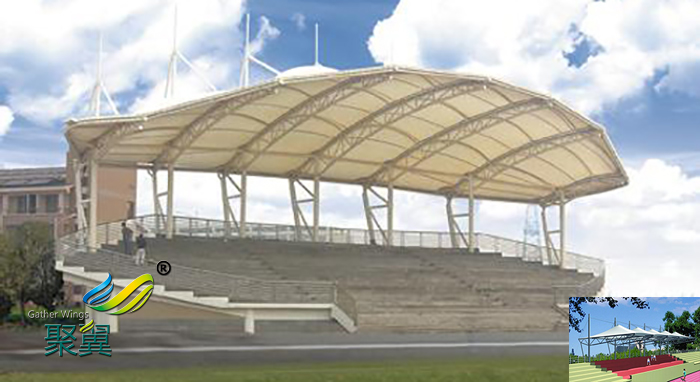 膜結構看臺是膜結構材料近年來應用的一個新領域,膜結構建筑能很好的籠罩全部的看臺,膜結構的張拉樣式使得建筑的空間跨度變的更大,同時能縮小建筑的結構,建筑的整體重量減輕,這樣施工就會變的簡單安全。這些都是膜結構被廣大用戶選擇的關鍵因素。膜材的表面都有一種涂層,涂層是為了預防灰塵雨水的影響,起到保護膜結構使用年限的作用。