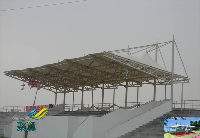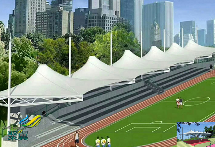 膜結(jié)構(gòu)體育防雨看臺(tái)球場(chǎng)膜經(jīng)濟(jì)實(shí)用性,制造成本低,造價(jià)便宜,采用的原材料便宜,僅為傳統(tǒng)建筑的三分之一左右,這也是人們選擇使用的重要因素之一。