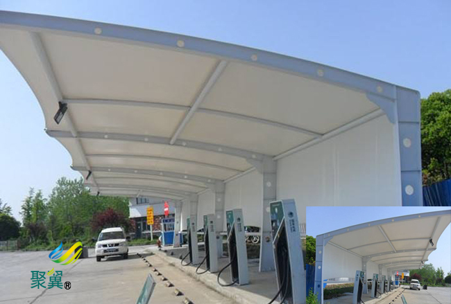 膜結構車棚自潔性, 膜結構車棚膜材料表面加涂的防護涂層(聚氟乙烯、丙烯酸等)具有耐高溫的特點。而且奉身不發粘。這樣落到膜結構車棚膜材表面的灰塵可以靠雨水的自然沖洗而達到自潔的效果。
