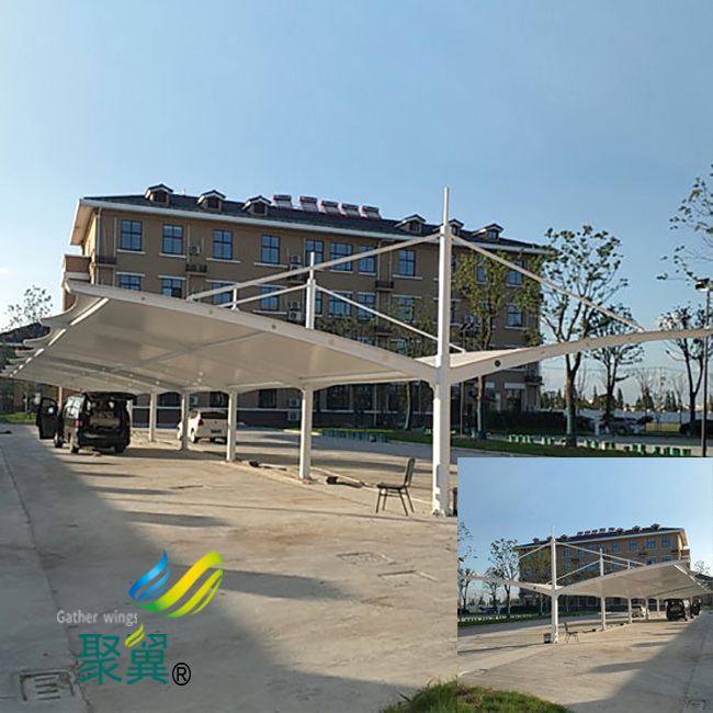 1、L形臨時(shí)膜結(jié)構(gòu)車棚 停車棚 鋼膜結(jié)構(gòu)汽車棚優(yōu)點(diǎn)有:不僅結(jié)實(shí)耐用,更美觀大方,并有較好的標(biāo)識(shí)展覽效果,展現(xiàn)學(xué)校個(gè)性化的一面。