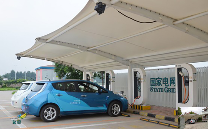 2、膜結構停車棚杰出的透光率:白天陽光透過修建物外表滲透到修建物中。夜晚,室內照明經過薄膜為空中增添了夢幻般的夜景。膜結構停車棚廠家為體育館和文娛設備膜結構時,理想的商業空間能夠與全天的舒適相結合。