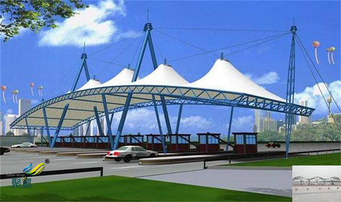 膜結構車棚自身是借助膜本身的張拉剪切力與支撐架和拉索相互組成的機制,此構造非常合適用于修建地市代表性房屋建筑,如體育與趣味性場館,口碑傳播的購物中心、飯店、地市的根基的至關重要房建,此時新式膜材用以此能夠反映出更強的好處。 在太陽的直射下,由膜遮蓋的房屋建筑內部填滿生態漫射光,無強差異的著亮面與陰影的區別,使房間內的空間視覺壞境更為寬闊和睦.