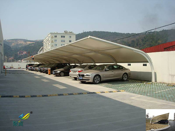 3、膜結構停車棚阻燃性:據國家GB8624-97測試屬阻燃B1級,無火滴、無毒氣。
