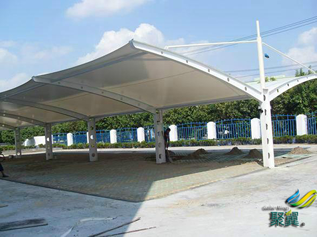 三、安吉膜結構車棚材料推薦:PVDF膜材面料(也可以用PVC膜材面料價格經濟實惠)配Q235鋼材料(鋼材料可以根據風荷載計算選材),橡膠面漆安全環保比普通鋼結構油漆防銹效果更好!更多材料方案,歡迎聯系聚翼膜結構車棚廠!