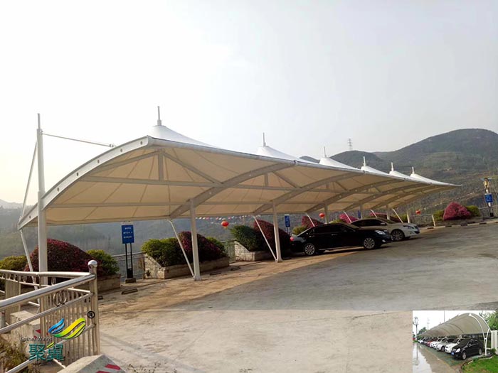 與傳統材料制作的汽車車棚相比,膜結構車棚的篷布材質是膜結構,而膜材的最大特點是強度高、耐久性好、防火難燃、自潔性好,不受紫外線影響,使用壽命長,一般15-30年。具有高透光率,透光率為13%,對熱能反射率73%,熱吸收量很少。
