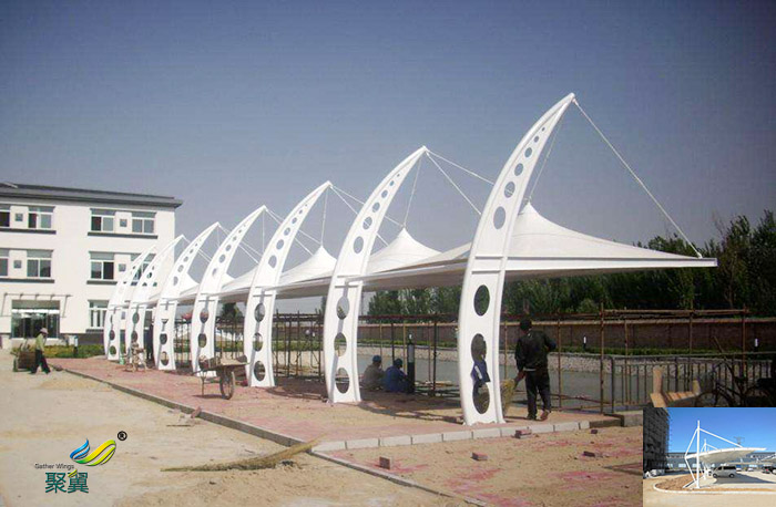 2. 藝術性:除了一般雨蓬不可比擬的實用、耐用、遮風擋雨的功能外,膜結構雨蓬更是一座雕塑,一件藝術品,給人美的視覺享受。其柔美,其曲線,其剛柔并濟,其豐富造型,其潔白無瑕,讓人眼前一亮,回味悠長。