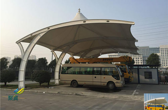 膜結構大巴車停車棚是以建筑織物,與支撐構件, 福建車棚以其新穎獨特的建筑造型,良好的受力特點-成為大跨度空間結構的主要形式之一 福建車棚發展原由 停車場的規劃和建設成為現代城市規劃的重要組成部分,變的越來越重要。膜結構輕巧、別致的造型在停車場及候車廳的建設中擔當了重要角色,除了滿足防風雨、防日曬等基本功能外,并有較好的標識招攬效果,展現了人們個性化的一面。 適用范圍 社區、學校、商業、體育館、工廠、政府機構等。 材料 鋼材、鋼索、膜材料等。 結構 是由多種高強薄膜材料。
