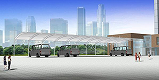 加油站大巴車棚膜結構輕巧、別致的造型在停車場及候車廳的建設中擔當了重要角色,除了滿足防風雨、防日曬等基本功能外,并有較好的標識招攬效果,展現了人們個性化的一面。